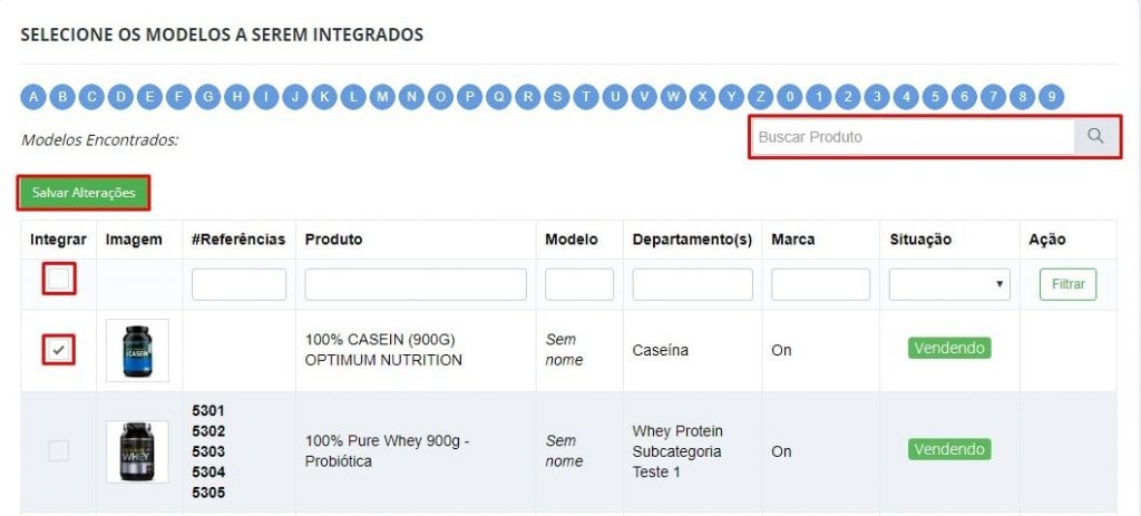 Após acessar esta página, recomendamos que leia atentamente as instruções na tela no quadro de “Atenção”. Após a leitura, role a página até o final para encontrar o bloco para selecionar os produtos a serem integrados, assim como mostra na imagem abaixo, onde poderá utilizar os filtros de busca tanto pelas letras inicias dos produtos, pelo campo de busca ou ainda pelo filtro da tabela do resultado.