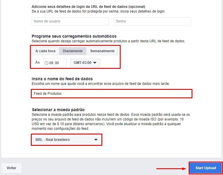Agora iremos programar os carregamentos automáticos, no caso colocaremos diariamente e definiremos um horário para que o Facebook possa ler o arquivo XML da sua loja. Insira um nome para o seu “Feed de Dados” e na última opção para selecionar a moeda padrão, procure e selecione a opção “BRL – Real Brasileiro”, na sequência clique no botão “Start Upload” ou “Iniciar envio” caso esteja traduzido.