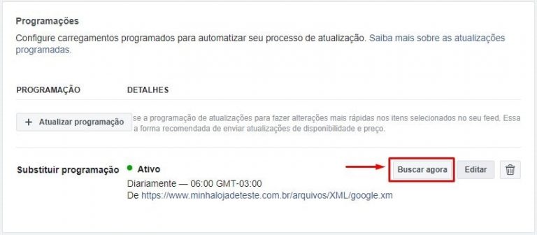 Nesta etapa final de adicionar os produtos no catálogo, será mostrada duas formas para vocês, uma de carregar o arquivo apenas uma vez e a outra que iremos utilizar neste manual que será “Definir uma programação”, pois o arquivo XML da plataforma é atualizado diariamente e os preços e estoques dos produtos podem sofrer alterações, desta forma os dois ambientes ficarão iguais. No campo “Adicione uma URL de feed de dados”, iremos colar o link do arquivo XML que foi gerado e copiado em sua loja virtual no menu “Integrações > Integrações XML > Facebook / Instagram”.