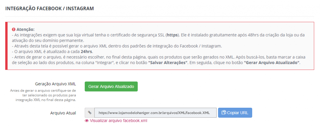 Na sequência você pode clicar no botão “Copiar URL” para que seja inserida nas configurações do Feed de Produtos no Catálogo do Facebook, onde mostraremos a seguir. Se quiser visualizar o arquivo para ver se os produtos foram inseridos, basta clicar no link que se encontra abaixo do campo do arquivo, no escrito “Visualizar arquivo facebook.xml”.