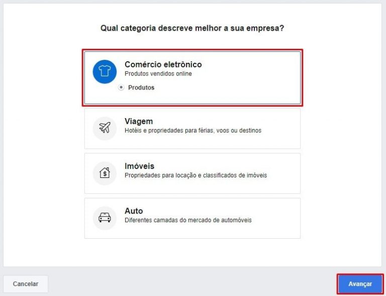 - Próxima tela, selecione o tipo de catálogo “Comércio eletrônico” e clique no botão “Avançar”.