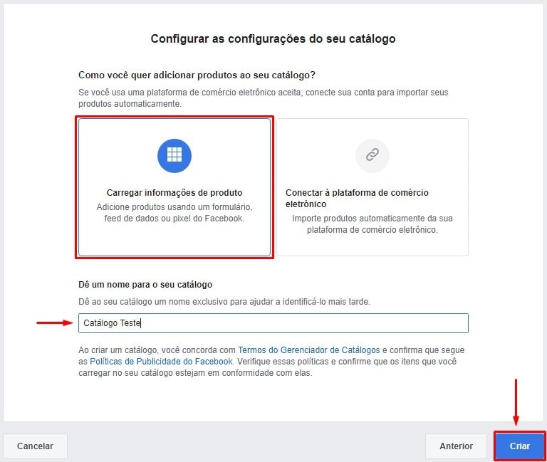 - Agora iremos dar início às configurações do seu catálogo. Selecione a primeira opção “Carregar informações de produto” e dê um nome que desejar ao seu catálogo de produtos no campo abaixo, na sequência clique no botão “Criar”.
