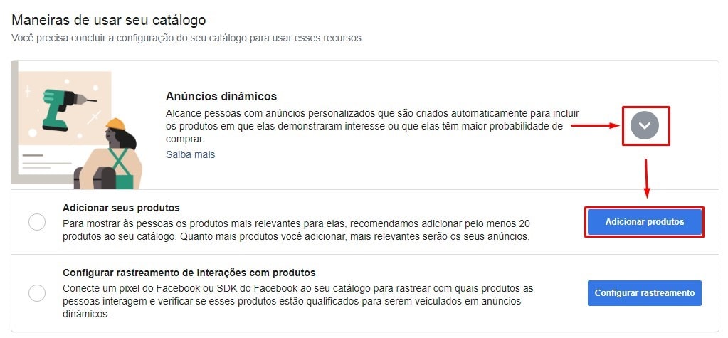- Na tela que será aberta, clique na opção de “Anúncios dinâmicos” e clique no botão “Adicionar produtos”.
