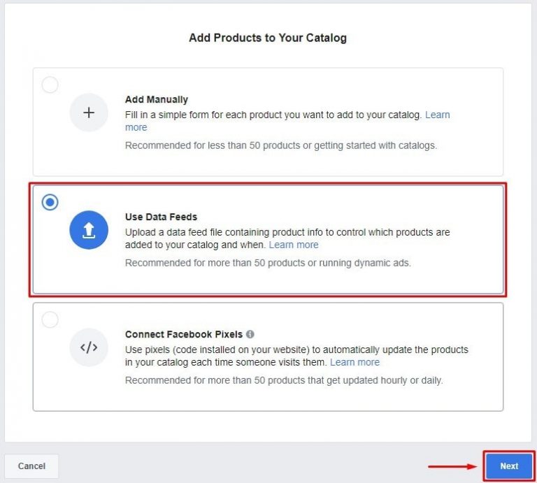 - Próximo passo é selecionar como os produtos serão inseridos em seu catálogo, utilizaremos a opção “Use Data Feeds” ou se a sua página estiver traduzida será “Use feeds de dados”, que será pelo arquivo XML que geramos e copiamos da plataforma. Na sequência clique no botão “Next” ou “Próximo” se estiver traduzido.