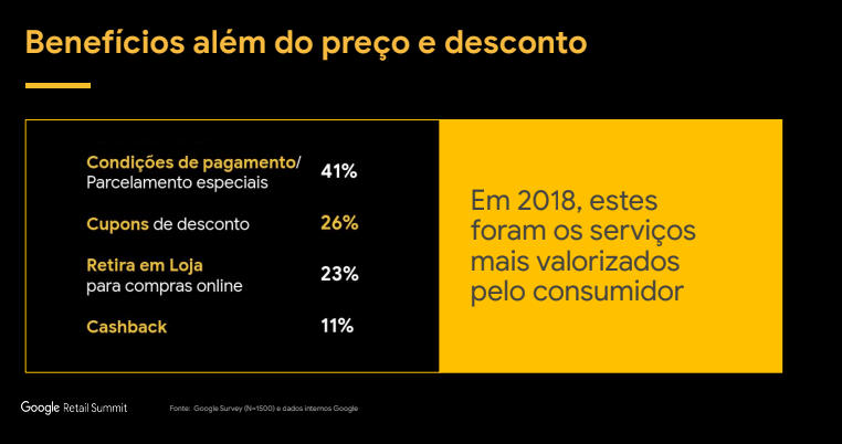 Recentemente foi divulgada uma pesquisa realizada pelo Google, durante o Retail Summit. Podemos, então, usá-la para montar nossas possíveis estratégias de promoções ou descontos que podemos realizar.