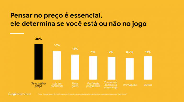 Todos os fatores mencionados anteriormente têm crescido de importância e não devem ser esquecidos ou subestimados. Porém, ter o melhor preço ainda é o item mais desejado por pessoas que compram nessas grandes datas do varejo, chegando a 30% dessas pessoas.